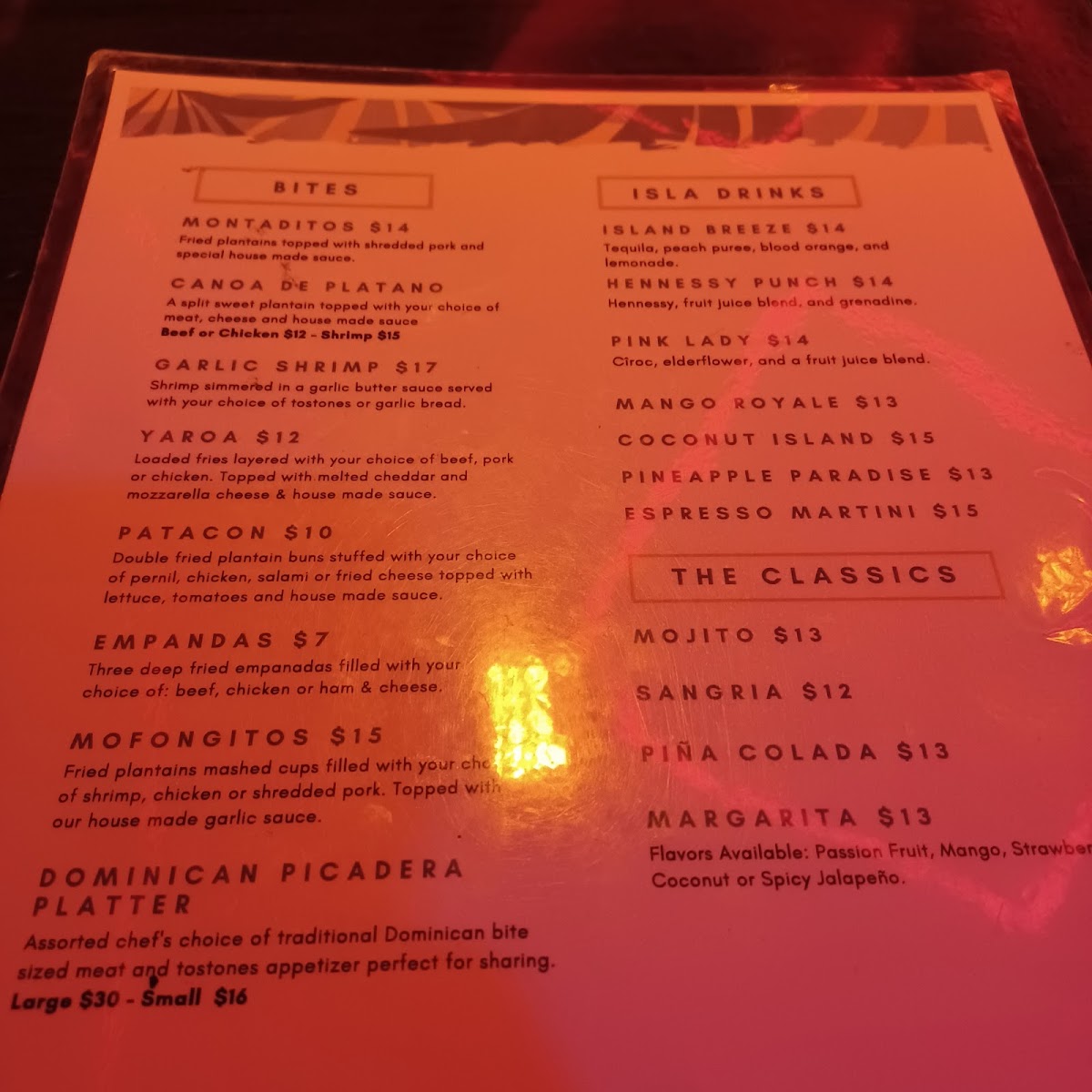 For salad enthusiasts, the Cajun Chicken Sesame Salad topped with burrata is a must-try, priced at $18.00. Sides like Yucka Fries and Maduros perfectly complement your meal, all available for $6.50 each. With an ambiance that blends warmth and liveliness, coupled with attentive service and exceptional drinks, Isla Bar & Grill promises an unforgettable dining experience that captures the heart of Dominican cuisine.