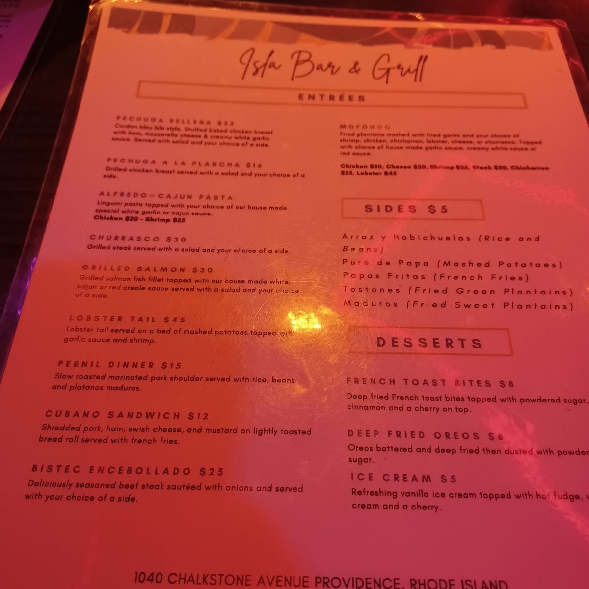Welcome to Isla Bar & Grill, a delightful gem located at 1040 Chalkstone Ave in Providence, RI. This vibrant eatery presents a menu that pays homage to traditional Dominican flavors while adding a contemporary twist. The star of the sandwich selection is the Pernil Chimi A La Isla, featuring slow-roasted pork shoulder for just $14.00, alongside crowd favorites like the Dominican Patacon and Chopped Cheese.